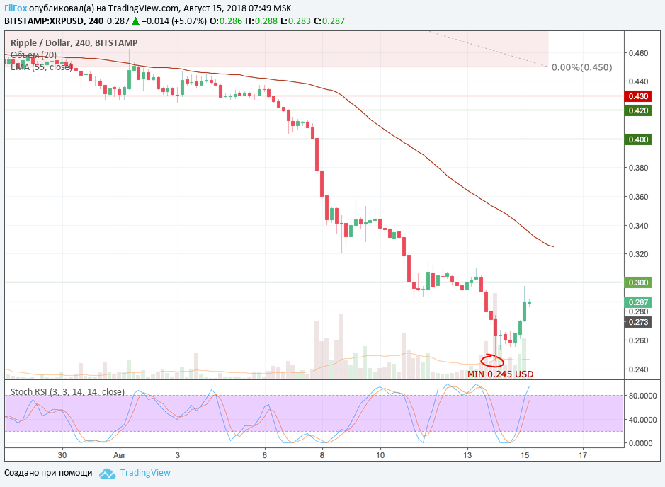 За последние дни, не только у Ripple, стало уже традицией, обновлять годовой минимум и уходить в коррекцию к ближайшему уровню сопротивления. Вчера очередной точкой минимума стала отметка 0.245 USD. Восстановление цены проходило к уровню 0.300 USD. Возможно до активизации медведей, цена ещё немного консолидируется под этим уровнем, но вскоре снижение цены приведёт к обновлению годового минимума. Полагаем, что следующий минимум будет в районе отметки 0.233 USD.