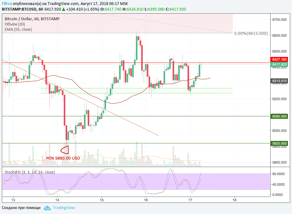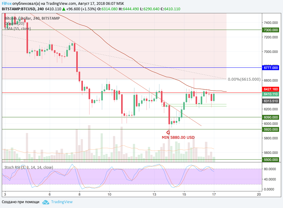 На четырёхчасовом графике стохастик бьётся на границе нейтральной зоны и зоны перекупленности. Если цена на малых объёмах всё-таки пробъёт сопротивление 6427.16 USD, то в любой момент максимум в области нулевого уровня фибоначчи 6615.00 USD может стать точкой разворота на снижение к поддержке 6090.00 USD.