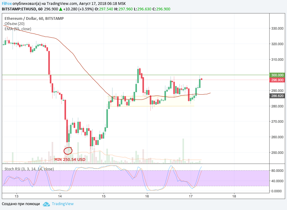 Вчера цена Ethereum не смогла преодолеть сопротивление 300.00 USD. Несколько бычьих импульсов пытались пробить этот уровень, но как в зеркале отражались от него, опускаясь в желтую зону поддержки. Если объёмы покупок не увеличатся, то пробить сопротивление на отметке 300.00 USD будет невозможно.