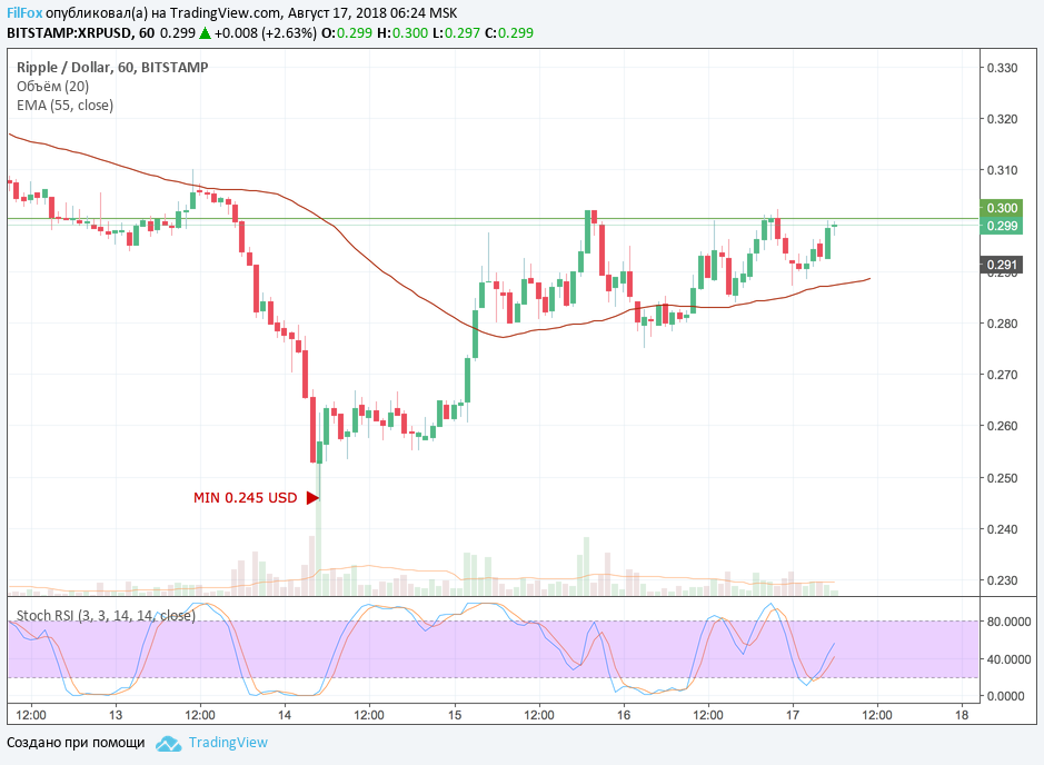 Организовать прорыв уровня 0.300 USD c последующим откатом вчера не удалось. Даже на скромно растущих объёмах покупки, Ripple не смог пробить уровень тридцати центов за монету. Если сегодня цена достигнет дневного максимума в области 0.310 USD, и стохастик в зоне перекупленности даст сигнал на продажи, можно открывать короткие позиции с целью 0.258 USD.