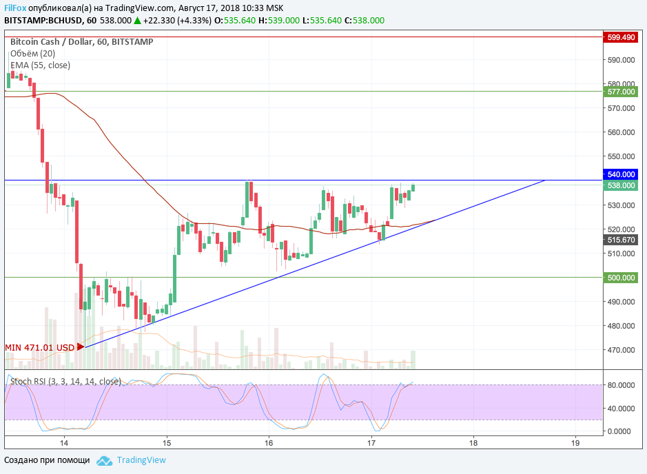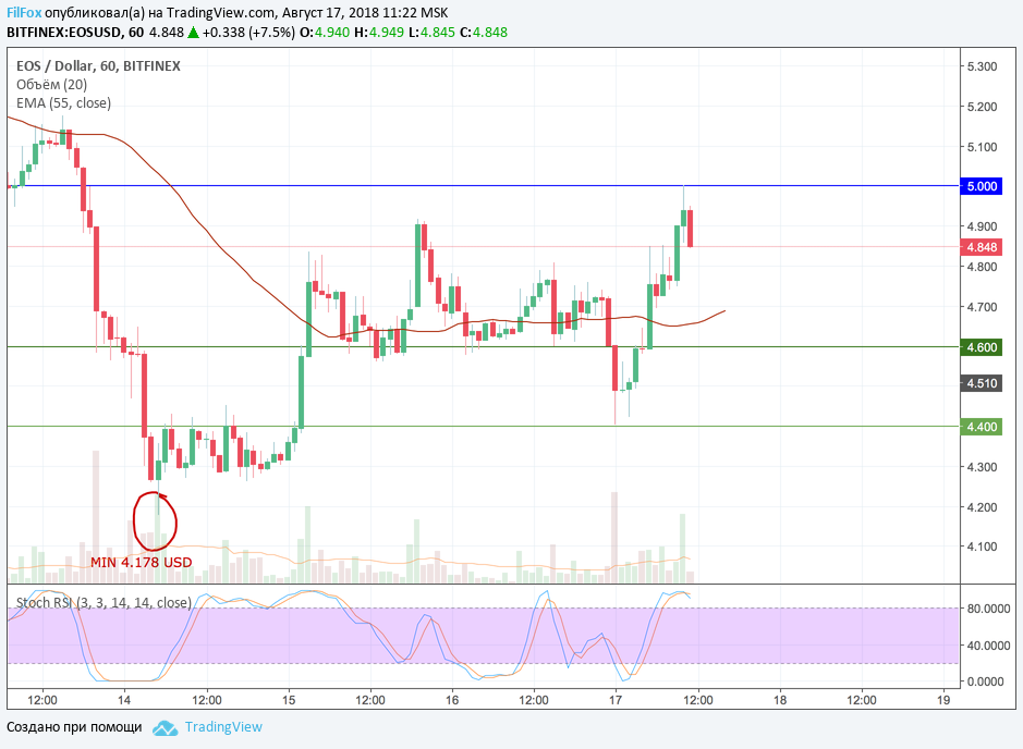 Попытку прорыва пятидолларового барьера EOS отложил на сегодня. Вчера цена умудрилась провалиться под довольно сильный уровень поддержки 4.60 USD и установить дневной минимум в точке 4.40 USD. За ночь пара смогла восстановиться на прежний уровень и с утра пыталась пробить сопротивление 5.00 USD.