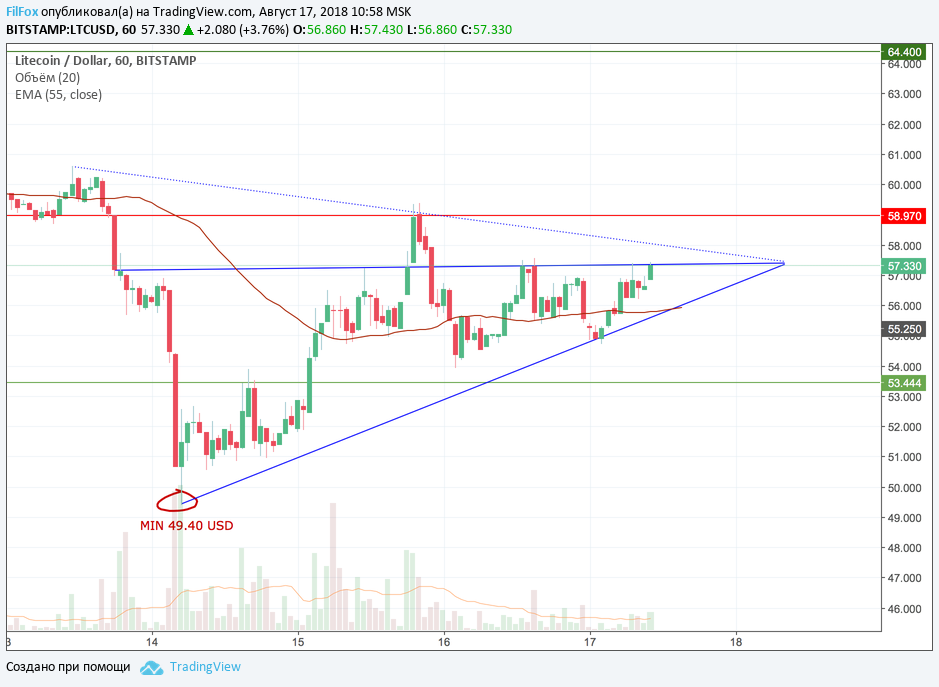 После того как Litecoin вчера перешел в консолидацию в области средних цен, пара так и не смогла пробить границу сужающегося диапазона на уровне 57.35 USD. Отсутствие бычьего прорыва на графике BTC/USD оказало влияние на весь рынок альткоинов. Затухание амплитуды колебания проходит на уменьшающихся объёмах, которые достигают среднемесячного уровня только при снижении цены к скользящей средней EMA55.