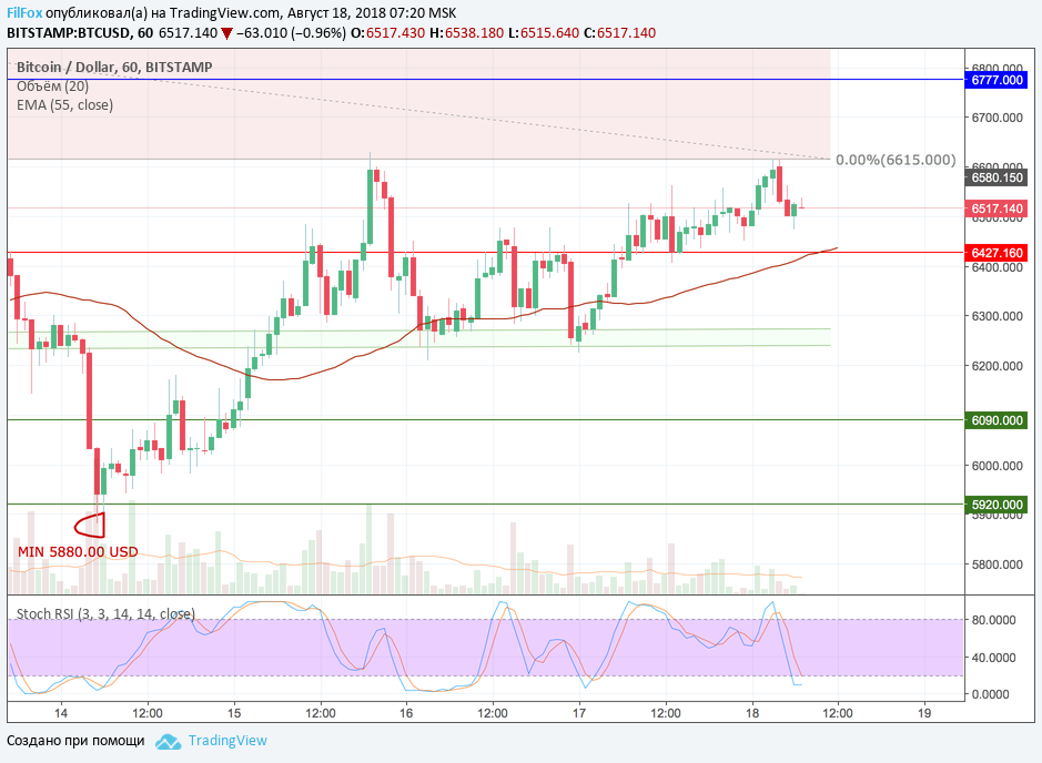 Вчера на малых объёмах цене BTC удалось пробить уровень сопротивления 6427.16 USD. Весь вчерашний день пара пыталась дотянуться до нулевого уровня фибоначчи 6615.00 USD.