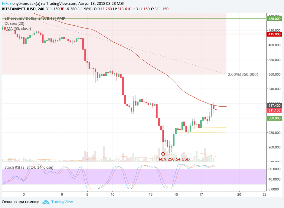 Ethereum вчера в первой половине дня двигался в боковом направлении под уровнем сопротивления 300.00 USD. Во второй половине дня даже незначительное увеличение объёмов позволило пробить это сопротивление и протестировать область средних цен, где проходит скользящая средняя (320.00 USD). Кривая EMA55 приостановила рост пары, но похоже, что он может возобновиться и протестировать 0% фибо (360.00 USD), следуя за динамикой пары BTC/USD.