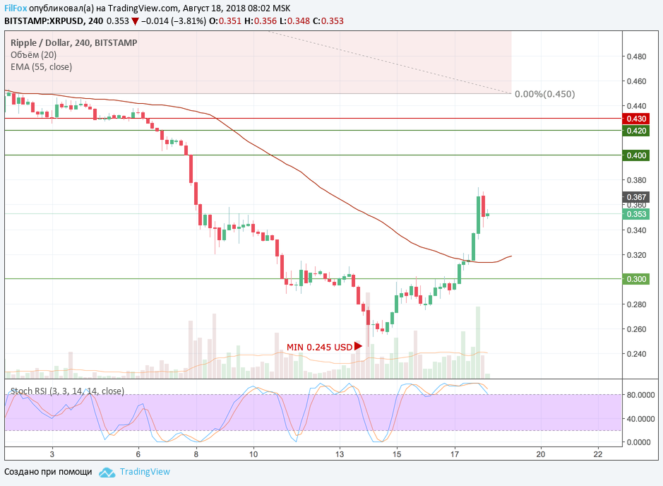 Вчера Ripple достиг отметки 0.310 USD, но четкого сигнала стохастика на продажу не было. Напротив, объёмы покупок существенно возросли, и пара достигла максимума в точке 0.374 USD. Возможно, рост интереса инвесторов к данному активу был вызван заявлением вице-президента отдела стратегического планирования компании Ripple, Джереми Лайта, о планах выхода на китайский рынок.