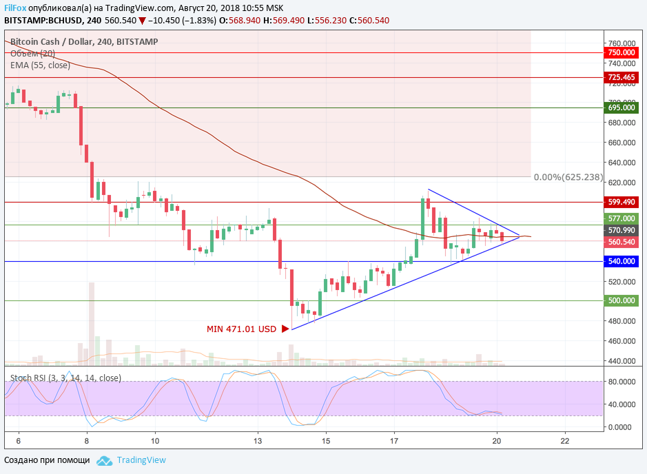 Пятничный прорыв Bitcoin Cash был остановлен сопротивлением 599.49 USD и на выходные цена ушла в боковик с сужающемся диапазоном. Сегодня высока вероятность прорыва нижней границы диапазона с последующим ре-тестом уровня поддержки 500.00 USD. В последнее время увеличение объёма выше среднего происходит только при снижении цены к очередным минимальным значениям. При отсутствии активности покупателей, цена может пробить эту поддержку и обновить абсолютный минимум в области 450.00 USD.