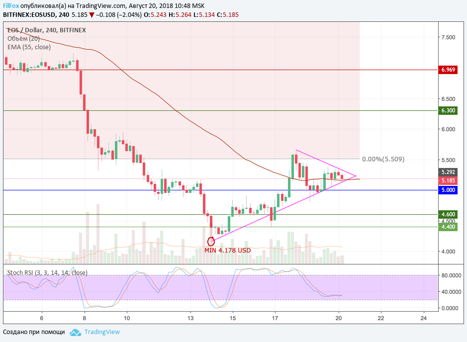 В пятницу цена EOS не смогла пробить нулевой уровень фибоначчи (5.509 USD) и откатилась к скользящей средней EMA55. На уровне средних цен пара провела выходные в сужающемся боковом диапазоне, постепенно уменьшая отклонение от кривой EMA55. Стохастик пока ещё в нейтральной зоне, но формирует сигнал на снижение. Сегодня пара прорвёт нижнюю границу треугольника и протестирует поддержку 4.60 USD.