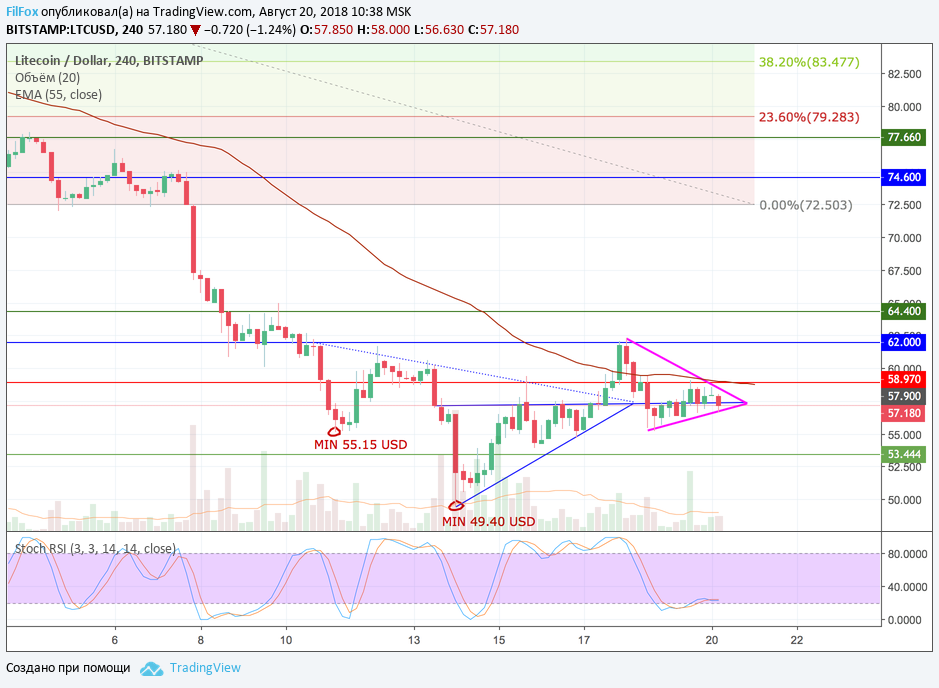 Перед уходом на выходные Litecoin пробил верхнюю пунктирную границу клина и установил недельный максимум в точке 62.30 USD. В воскресенье цена вернулась к средней линии клина 57.44 USD и консолидировалась в боковом диапазоне, уменьшая амплитуду отклонения в пределах фиолетового треугольника.