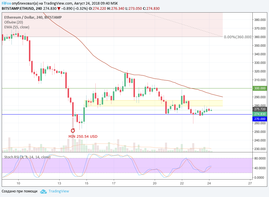 Вчера Ethereum консолидировался в более узком диапазоне, чем трёхнедельный боковик. Цена улеглась на поддержку 270.00 USD и не в силах преодолеть сопротивление желтой зоны. Полагаем, что при выходе из диапазона цена с большей вероятностью обновит минимум в районе 240.00 USD, чем протестирует нулевой фибо на уровне 360.00 USD.