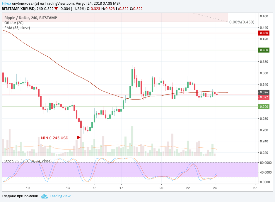 Ripple сужает диапазон консолидации таким образом, что заработать во флэте уже не возможно. Вчера пара консолидировалась в узком диапазоне под скользящей средней EMA55. Более вероятный выход из боковика - это прорыв поддержки 0.300 USD и обновление минимума в области 0.233 USD.