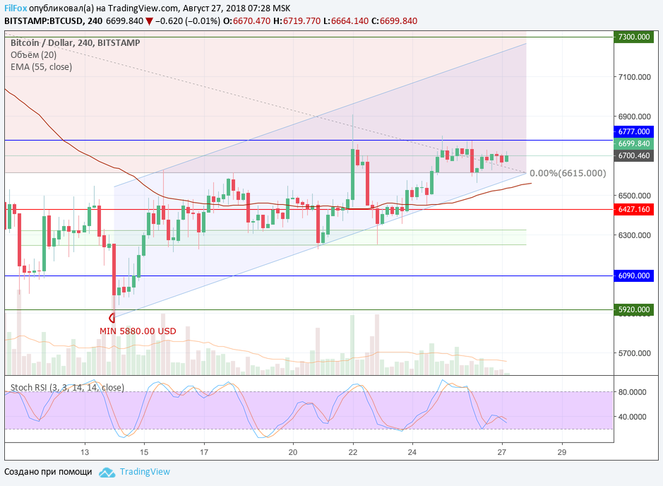 Как мы вчера предполагали, на недельном графике закрылась вторая зелёная свеча. Bitcoin, находясь в боковом диапазоне, вторую неделю демонстрирует признаки роста. Хоть они не являются стабильными и выглядят призрачно, однако можно построить вполне не призрачный восходящий фиолетовый канал, в котором пара продвигается к целевой отметке 7300.00 USD.
