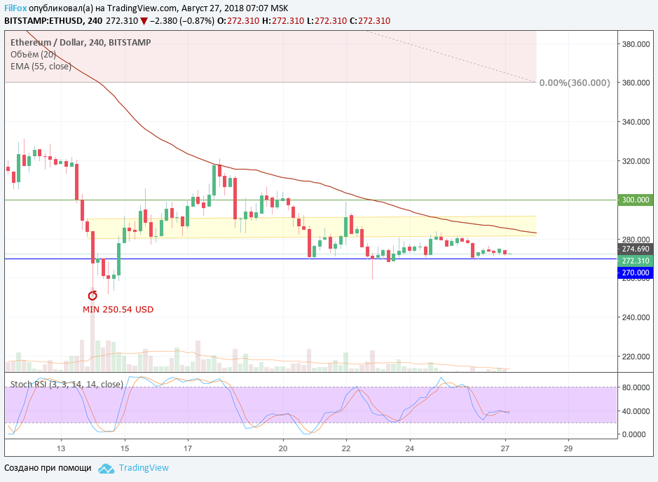 Ethereum проводит время в узком боковом диапазоне без признаков роста. Однако уровень поддержки 270.00 USD отрабатывает намного надёжнее, чем желтая область сопротивления. Стоит отметить отсутствие корреляции между слабым восхождением пары BTC/USD в фиолетовом канале и сужающимся боковиком пары ETH/USD. Справедливо более общее утверждение, что весь рынок находится в боковом диапазоне. На этой неделе ожидаем синхронный выход из боковика.