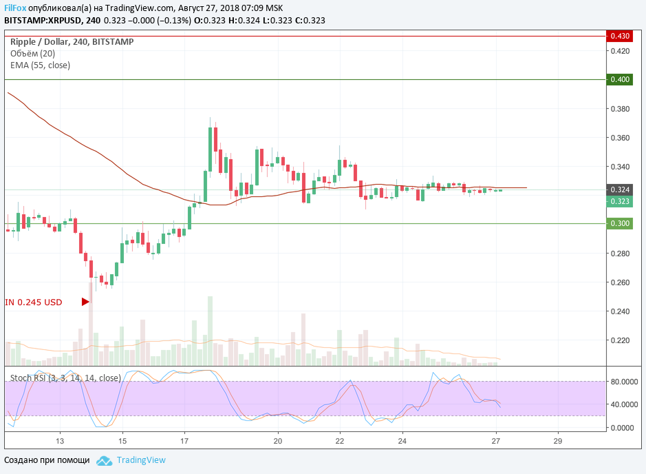 Ripple основательно готовился к выходу из бокового диапазона, сужая амплитуду консолидации возле уровня средних цен. Индикатором роста к целевому уровню 0.430 USD будет прорыв выше 0.333 USD. От снижения цену удерживает поддержка 0.300 USD. Если она не сможет развернуть цену, то вероятность дальнейшего снижения и обновления годового минимума сильно возрастёт.