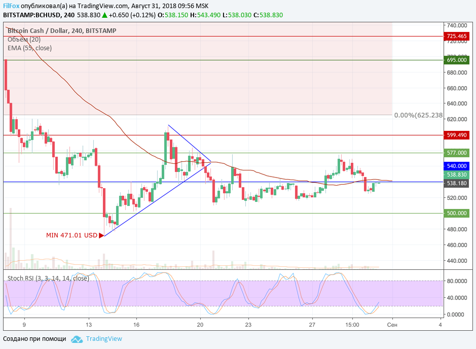 Bitcoin Cash снижался к поддержке 540.00 USD, которая должна была помочь паре в восстановлении к сопротивлению на уровне 577.00 USD. Но вчера цена актива ушла гораздо ниже уровня средних цен и установила дневной минимум в точке 525.21 USD. Сегодня восстановление пары на уровне средних цен перейдёт в консолидацию под скользящей средней EMA55.