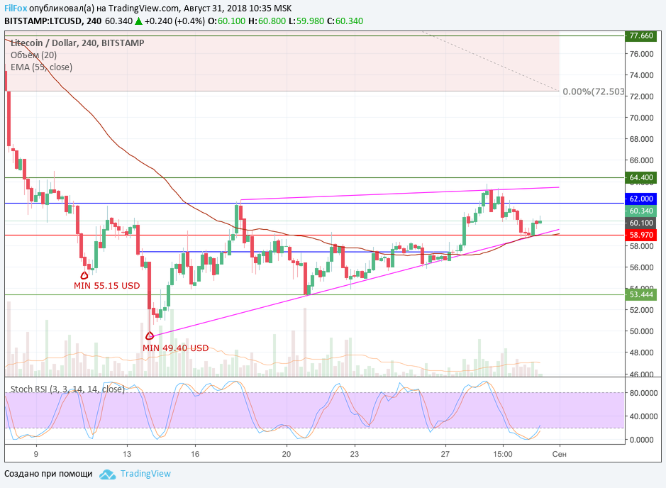 Litecoin вчера, снижаясь в рамках своего бокового диапазона, достиг поддержки уровня 58.97 USD и скользящей средней EMA55. Ночью, от этого уровня, пара начала восстанавливаться к сопротивлению 62.00 USD, которое не подпускало цены LTC к ре-тесту верхней границы бокового диапазона. Если сегодня покупатели смогут продавить это сопротивление, то цена все равно не пробьёт уровень 64.40 USD. Полагаем, что дневной максимум будет лежать на верхней фиолетовой границе клина, в области 63.44 USD.
