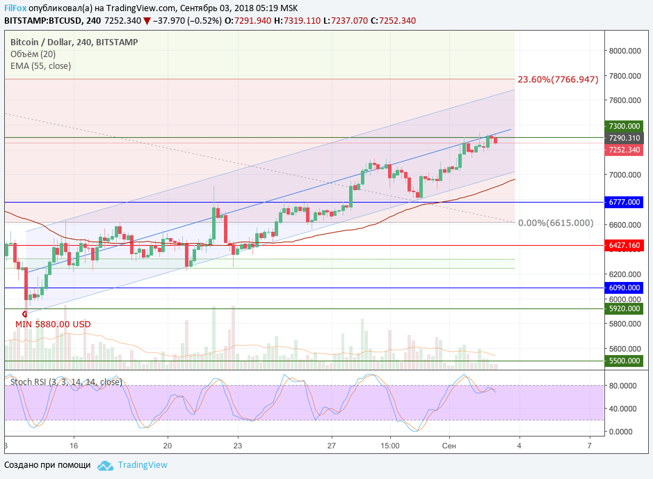 Вчера пара BTC/USD обновила недельный минимум до отметки 7334.50 USD, которая находится чуть выше средней линии восходящего канала. Однако закрепиться выше этой линии пока не удалось.