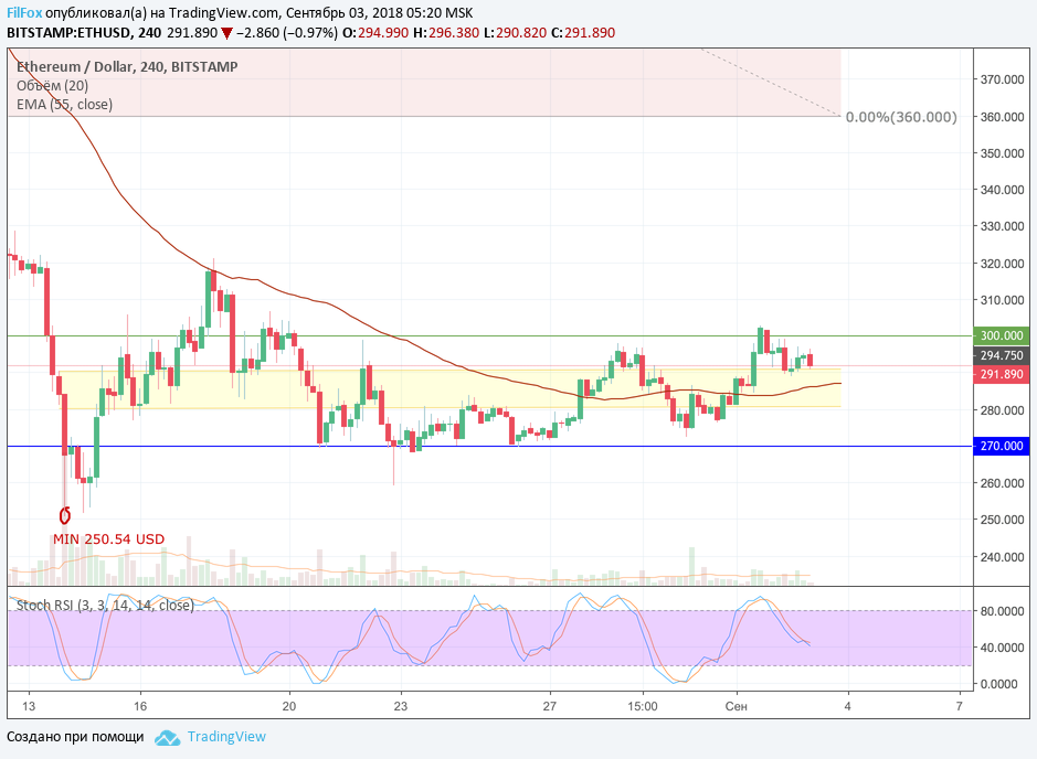 Ethereum вчера откатился от верхней границы бокового коридора на уровне 300.00 USD и встретил поддержку желтой области. На этой неделе паре удастся преодолеть сильное сопротивление верхней границы боковика и протестировать цены в районе 320 долларов за эфир.