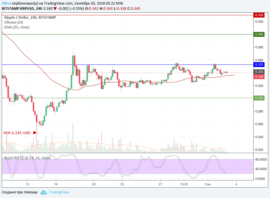 Ripple, находясь четвёртую неделю во флэте, каждый раз после ре-теста верхней границы боковика откатывается к уровню средних цен. Вчерашний день не был исключением. Продавить цену сквозь верхнюю границу на малых объёмах не получается. После того, как стохастик даст сигнал на покупку любителям заработать во флэте, на предсказуемом колебании рипла можно получить свой небольшой кусочек профита.