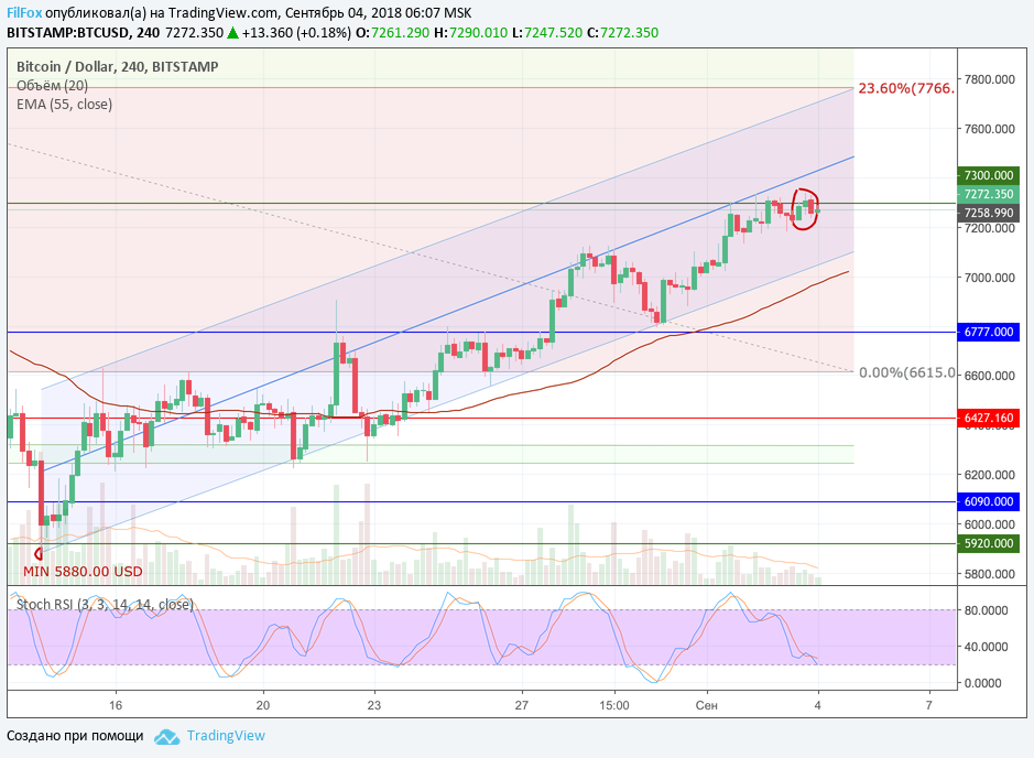 Вчера пара BTC/USD не смогла пробить сопротивление 7300.00 USD. Похоже, рынок ожидает откат от недельного максимума