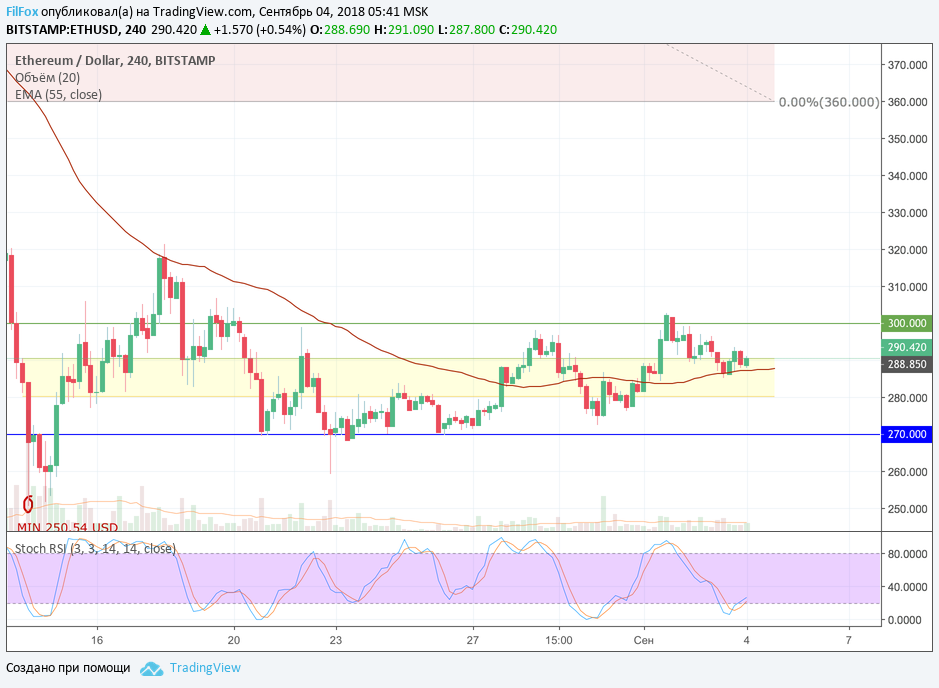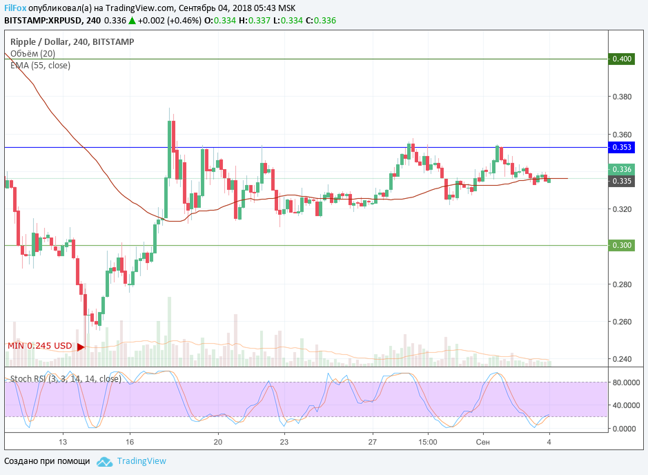 Ripple вчера предсказуемо откатился к уровню скользящей средней EMA55 и в течение дня консолидировался в узком диапазоне на уровне средних цен. Объёмы торгов существенно сокращаются. Сегодня снижение в пределах бокового диапазона может продолжиться в область 0.310 USD.