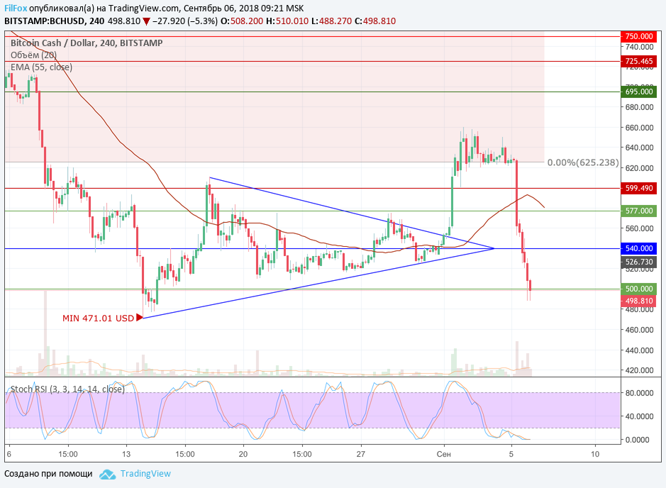 Вернувшись в пределы пятинедельного флэта, цена пытается консолидироваться возле его нижней границы 500.00 USD. И если в ближайшее время цена не сможет восстановиться к сопротивлению 540.00 USD, то в дальнейшем нас ожидает падение цены ниже поддержки 500.00 USD и обновление абсолютного минимума, установленного 14 августа на отметке 471.01 USD.