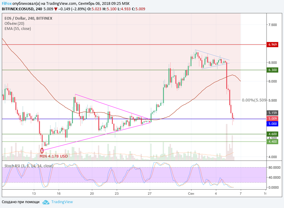 Вчера, после ре-теста верхней границы вымпела, цена EOS пробила его нижнюю границу и упала до синей линии пятидолларовой поддержки. Установив минимум в точке 4.84 USD, пара отскочила чуть выше поддержки 5.00 USD.
