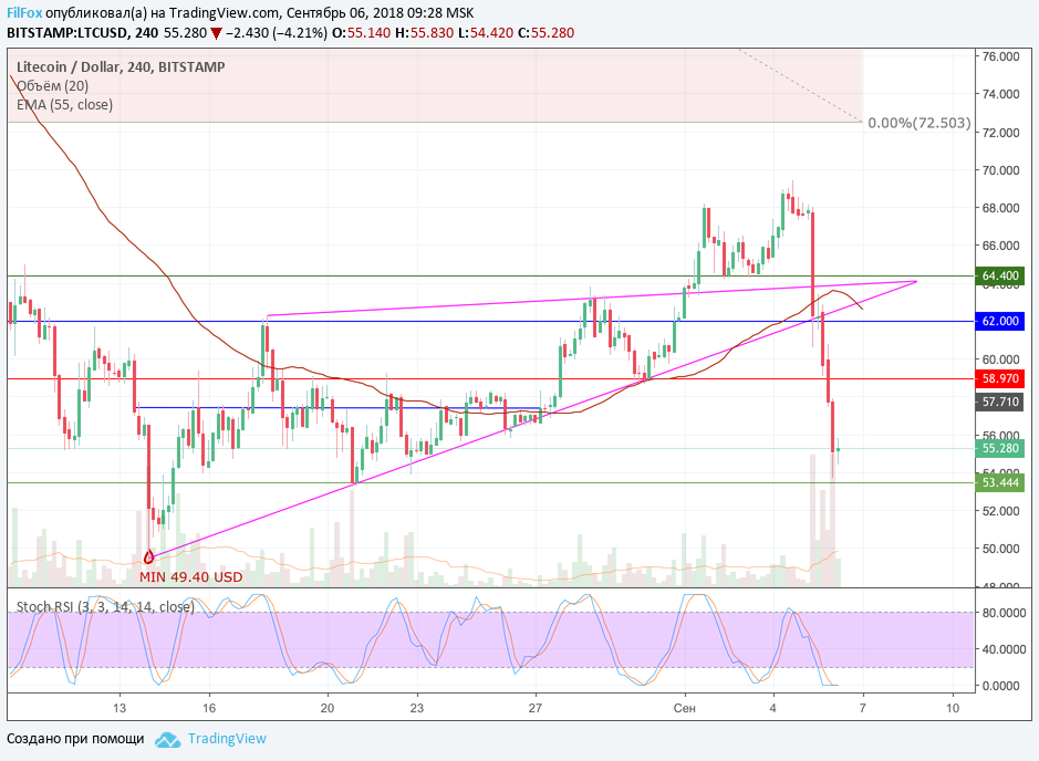 Вчера консолидация Litecoin в узком диапазоне была прервана интенсивным снижением цены, в результате которого пара вернулась в привычный для себя боковик. Цена приостановила снижение и начала восстановление только в области 55 долларов за лайт. Полагаем, что сегодня, снижение к нижней границе бокового диапазона продолжится, но цена сможет удержаться в пределах бокового коридора используя поддержку уровня 53.444 USD.