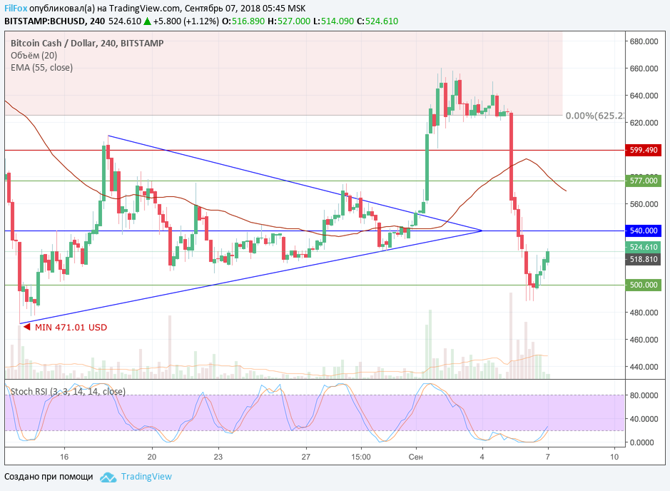 Вчера цена BCH не смогла восстановиться к уровню 540.00 USD. Сегодня утром пара развернулась на локальном максимуме 527.00 USD и, судя по всему, начала снижение в зону минимума на уровне 471.01 USD.