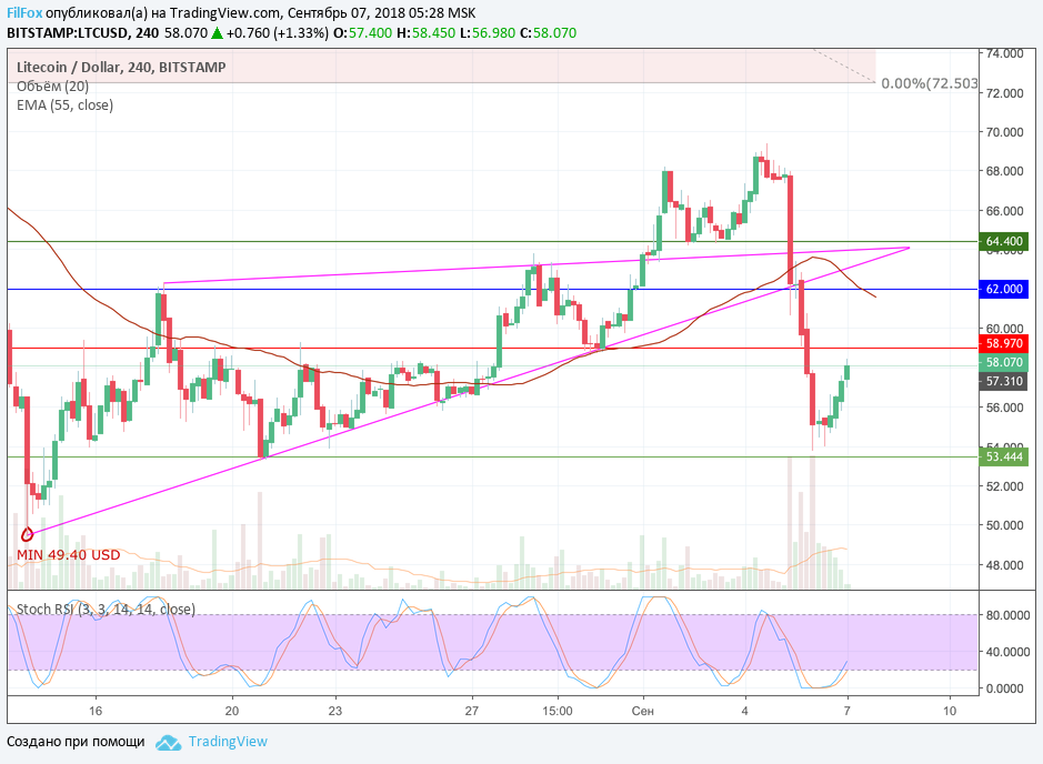 От уровня поддержки 53.44 USD, пара вчера смогла восстановиться практически к средней линии бокового коридора, который покинула первого сентября. Сейчас цена Litecoin постепенно снижается к нижней границе этого боковика и вполне возможно, что, используя поддержку на уровне 53.44 , она будет консолидироваться в этой области. Обновление годового минимума ожидается на предстоящем уикенде.
