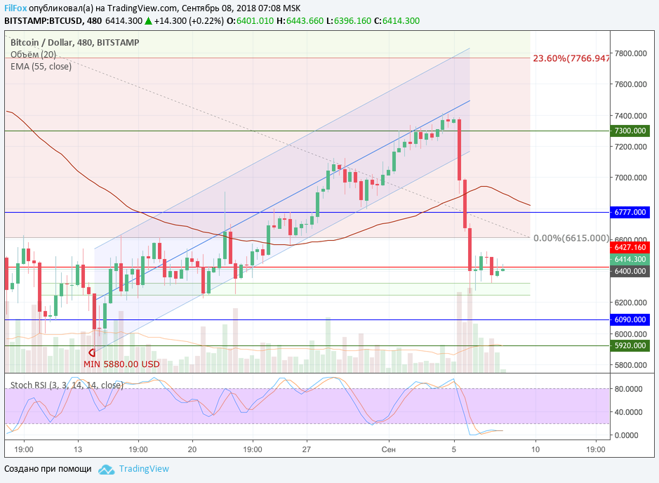 Вчера зеленая зона поддержки вновь смогла развернуть снижение. Попытка медведей продавить цену ниже зелёной зоны закончилась восстановлением цены BTC на уровень первоапрельского минимума (6427.16 USD). Сегодня попытки возобновятся, но смогут ли они достигнуть целевого уровня 6090.00 USD, будет зависеть от объёмов.