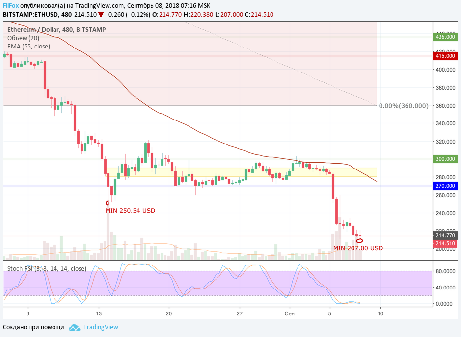 Вчера цена Ethereum постепенно снижалась в область цен 200 долларов за эфир. Новое значение годового минимума установлено на отметке 207.00 USD. Возможно, на сегодня этого минимума будет достаточно и пара восстановится в зону консолидации 220.00 USD, где и пробудет до завершения дня.