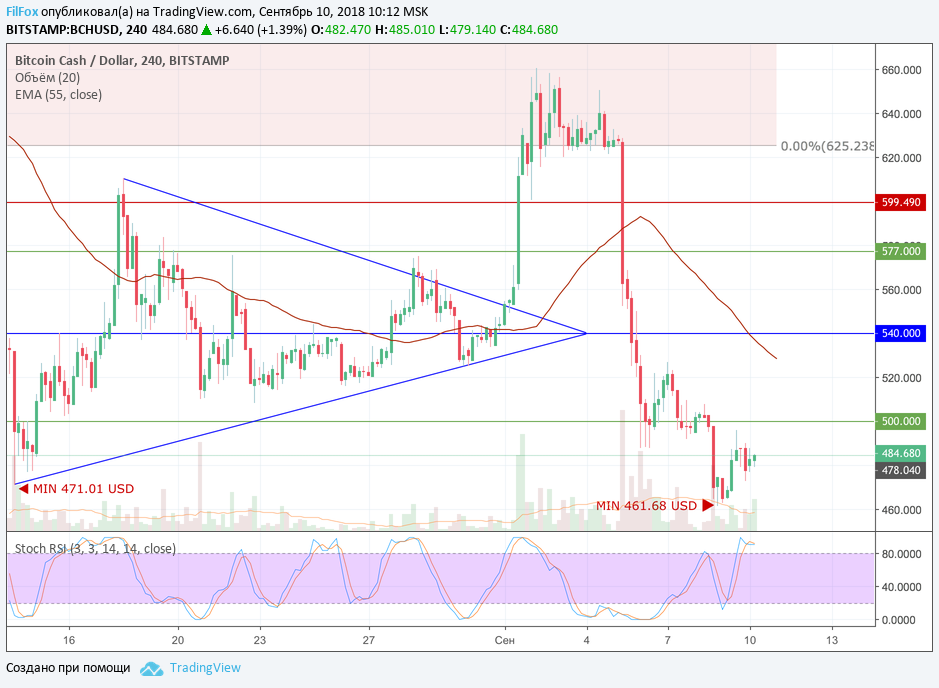 В субботу цена Bitcoin Cash пробила поддержку 500.00 USD, а рано утром в воскресенье значение абсолютного минимума обновилось до уровня 461.68 USD. В течение всего дня цена пыталась восстановиться к нижней границе бокового диапазона, но из-за сокращающихся объёмов достичь уровень 500.00 USD так и не удалось.