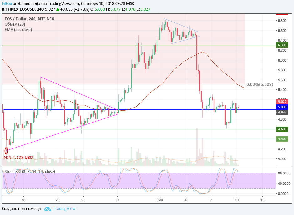 В субботу медведям удалось продавить цену ниже пятидолларового рубежа, но, как мы и предполагали, EOS смог удержаться в пределах своего бокового диапазона. Нижняя граница боковика развернула пару на восстановление, и в воскресенье значение цены возвратилось выше уровня 5.00 USD.