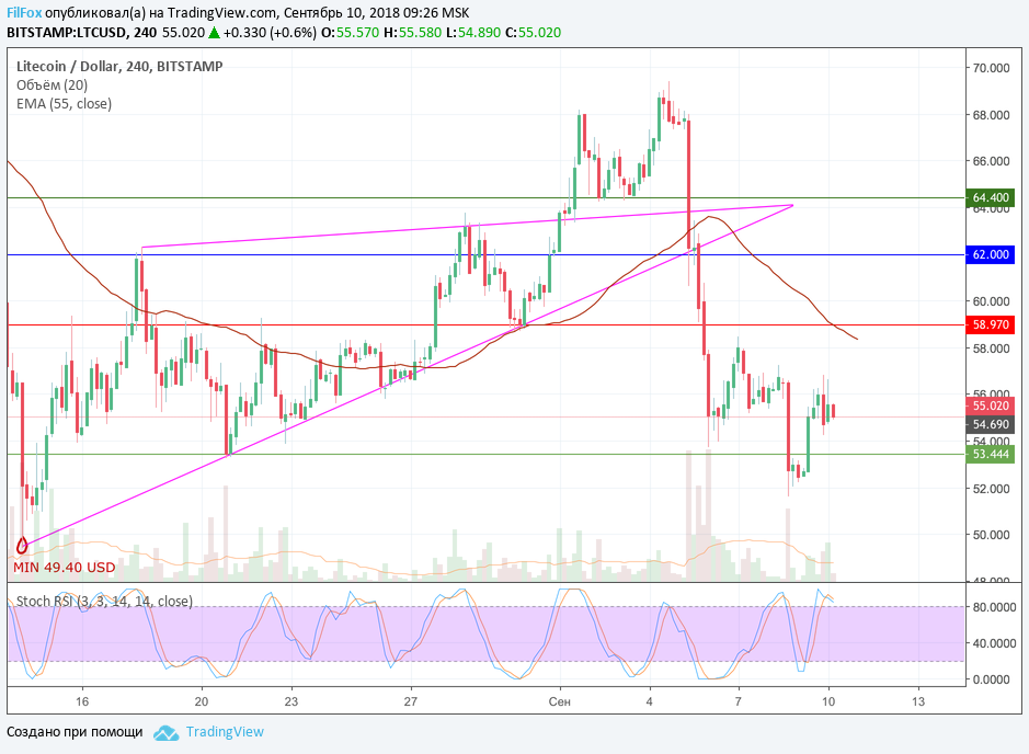 На выходных цена Litecoin пробила поддержку нижней границы бокового диапазона 53.44 USD и установила минимум в точке 51.62 USD. Вскоре цена вновь восстановилась в пределы боковика и сейчас консолидируется в области цен 55 долларов за лайт. Сегодня снижение возобновится в район предыдущего минимума 50.00 USD. Полагаем, что в начале недели годовой минимум обновится в области 48.00 USD.