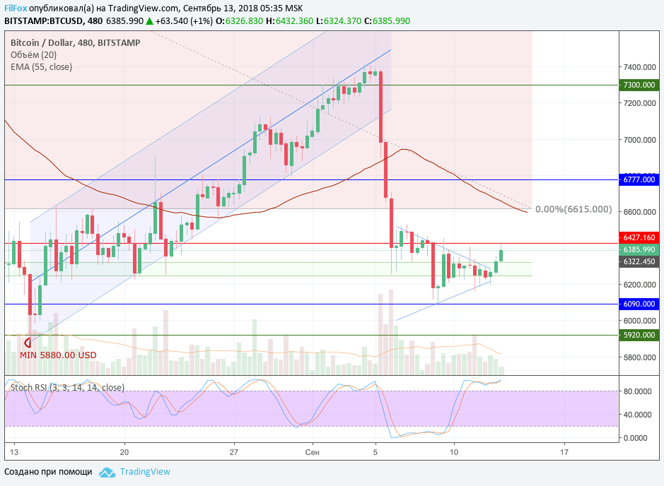 Вчера, находясь в сужающемся диапазоне, цена Bitcoin, в очередной раз, протестировала нижнюю границу вымпела. Затем, на средних объёмах, цене BTC удалось прорвать его верхнюю границу, а на снижающемся торговом объёме цена протестировала сопротивление первоапрельского минимума 6427.16 USD.