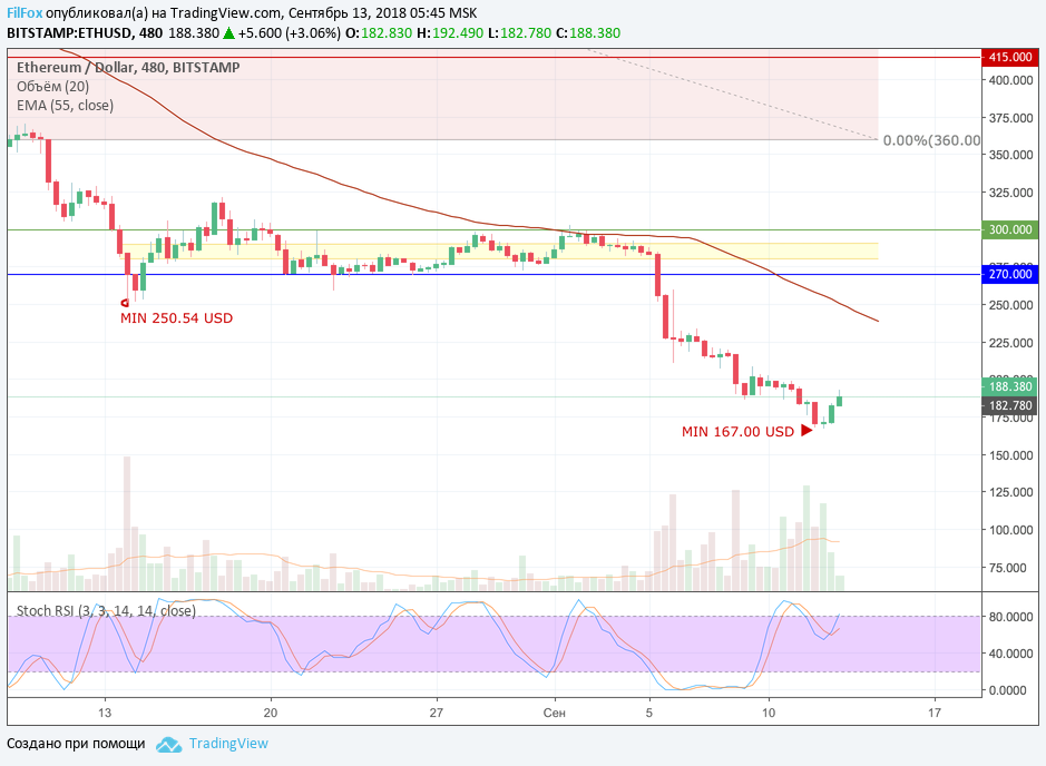 Вчера, в первой половине дня, Ethereum обновил своё минимальное значение до уровня 167.00 USD. После того, как пара BTC/USD пробила верхнюю границу сужающегося боковика, цена пары ETH/USD последовала её примеру и продемонстрировала восстановление в область 190.00 USD.