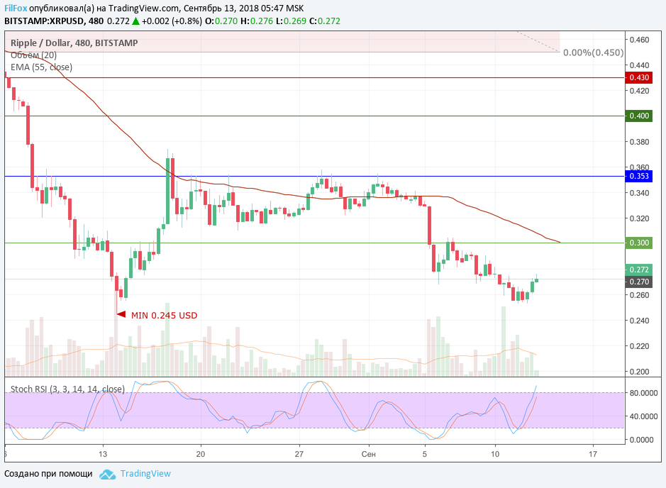 Если пара протестирует уровень сопротивления 0.300 USD, то это будет означать восстановление до уровня средних цен. Пересечение кривой EMA55 укажет на краткосрочную смену даун-тренда на восходящий тренд. Но для этого мы должны увидеть подтверждение объёмами. Иначе годовой минимум Ripple сдвинется ниже уровня 0.240 USD.