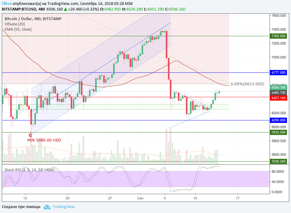 Вчерашнее наблюдение за динамикой цен позволяет сказать, что на рынке - полноценное восстановление цены, после продолжительного снижения и консолидации. Паре BTC/USD удалось закрепиться выше сопротивления 6427.16 USD, следовательно - сегодня нас ожидает ре-тест нулевого уровня фибоначчи 6615.00 USD.