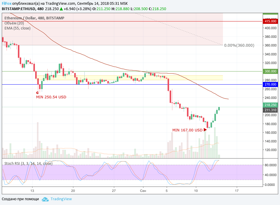 Ethereum вчера смог восстановиться в область психологической отметки 200 долларов за эфир благодоря большим объёмам покупок, в два раза превышающим средние объёмы торгов. Дальнейшее восстановление пары до уровня 270.00 USD, который является нижней границей недавнего бокового диапазона, возможен после преодоления сопротивления скользящей средней EMA55, проходящей в области 238.00 USD. Примерно в этой области ожидаем консолидацию цены ETH.