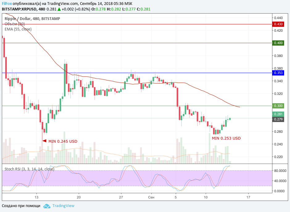 Вчера Ripple на довольно крупных объёмах смог восстановиться в область 0.280 USD. Ближайшей целью для дальнейшего восстановления служит уровень средних цен, который сейчас совпадает с сопротивлением 0.300 USD.