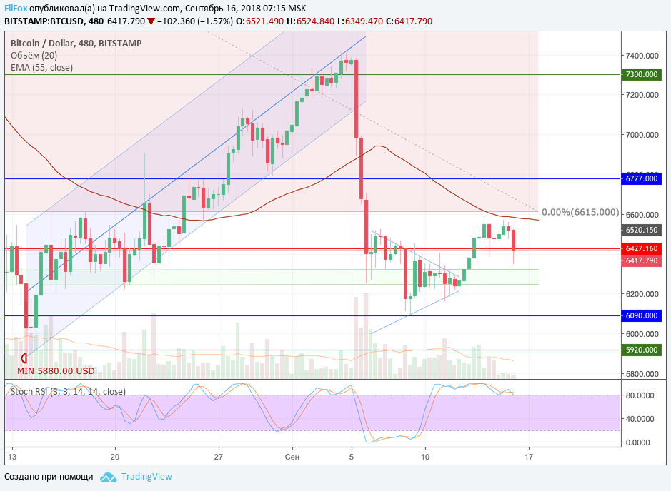 Сегодня цена BTC уже успела побывать в точке минимума 6349.00 USD. Исходя из технического анализа динамики пары, можно сделать вывод, что первоначальный импульс на восстановление цены постепенно затухает и, в ближайшее время, цена может вернуться к снижению.