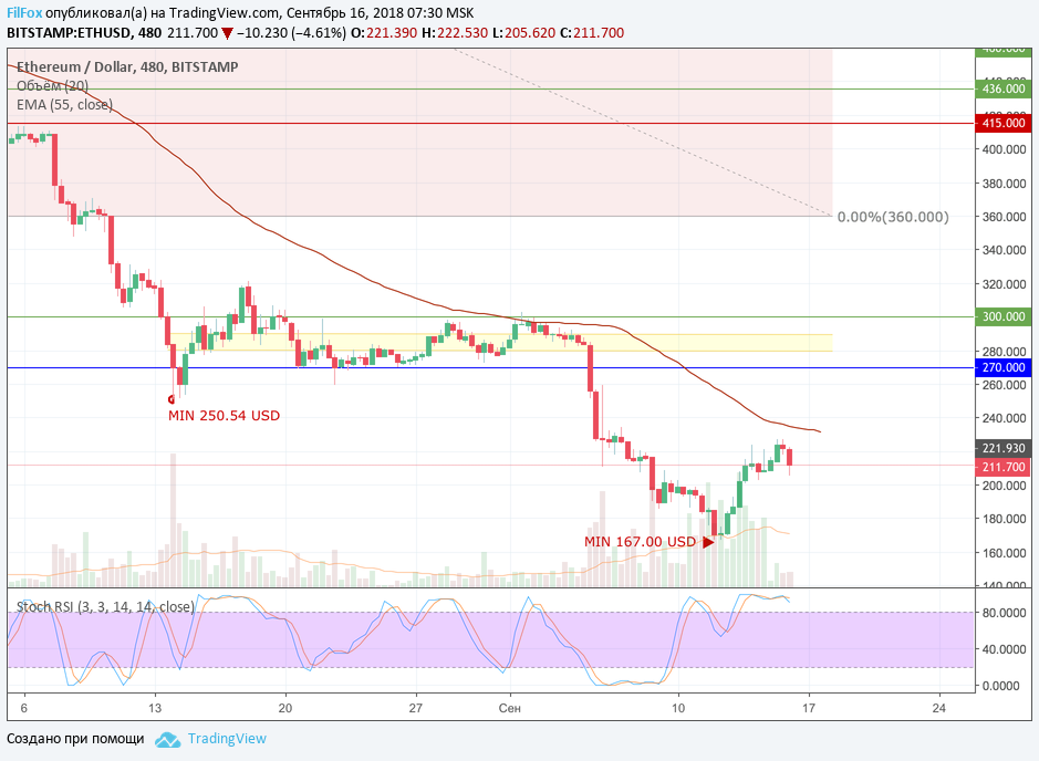 После непродолжительной консолидации над этим уровнем, эфир повторил попытку достигнуть уровня средних цен, но в итоге от вчерашнего максимума 227.00 USD, пара откатилась к уровню 205.00 USD. Объёмы торгов на выходные резко сократились. Полагаем, что после небольшого восстановления, снижение пары продолжится и цена вновь опустится ниже планки двести долларов за эфир.