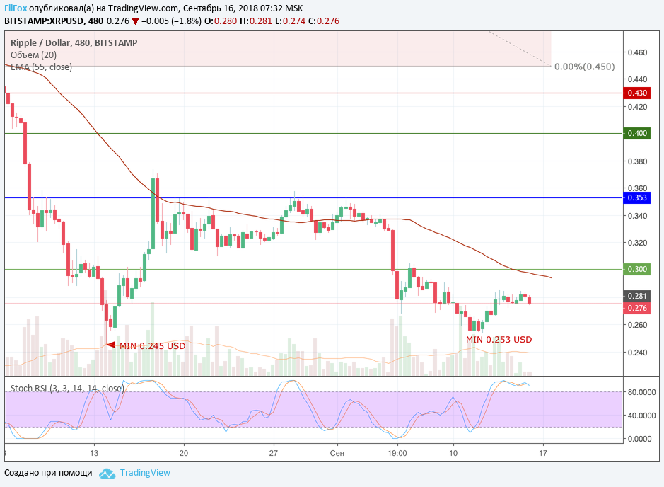 Ripple на этой неделе не обновил годовой минимум, который был установлен месяц назад, 14 августа, в точке 0.245 USD. В эту среду цена несколько раз коснулась уровня 0.253 USD и пара начала восстанавливаться. Несмотря на довольно большие объёмы покупок, пара смогла восстановиться только до уровня 0.285 USD. Всё остальное время она консолидировалась в области $0.27 - $0.28.