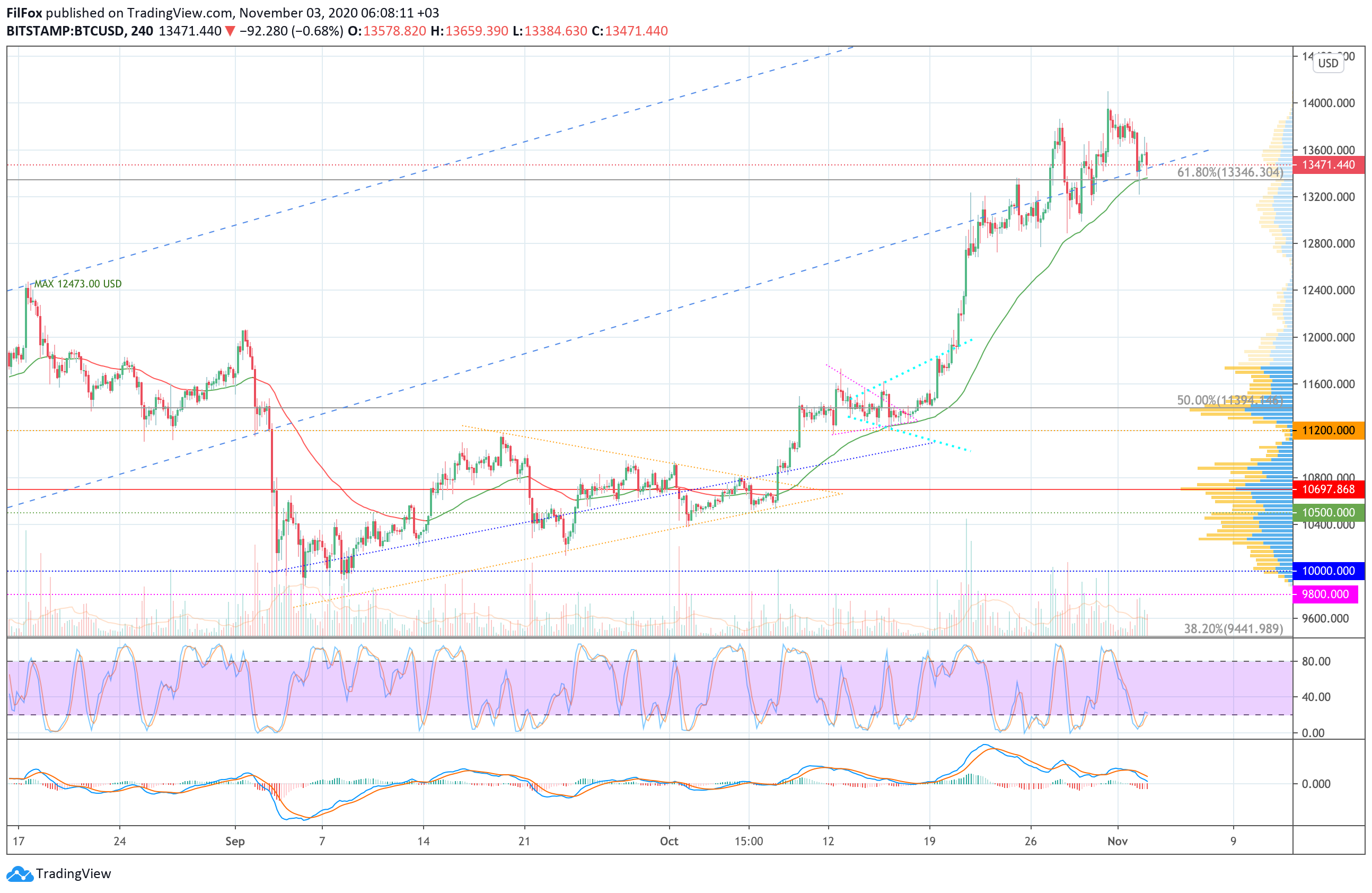 Вчера утром медведи усилили натиск и продавили поддержку 13600.00 USD. Цена биткоина выпала из восходящего синего канала и проколола уровень 61.6% фибо (13346.30 USD). Дневной минимум установлен в точке 13220.00 USD.