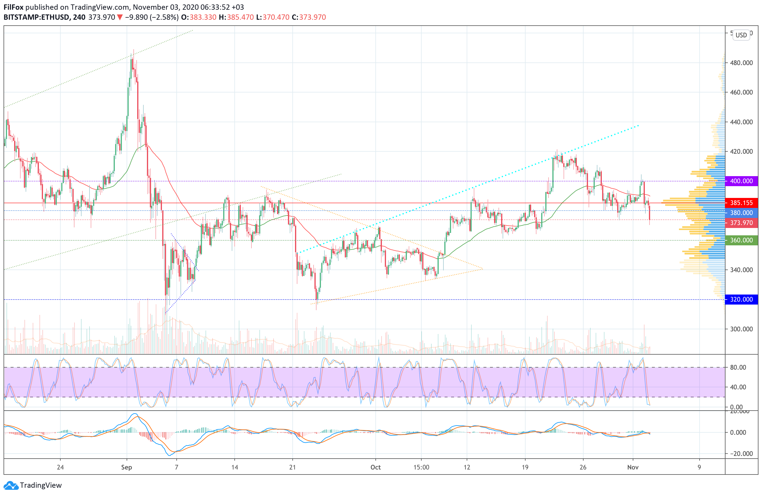Вчера покупатели не смогли нарастить объёмы и продолжить рост выше психологической отметки 400.00 USD. Медведи развернули цену эфира на снижение и откатили пару к поддержке 380.00 USD.