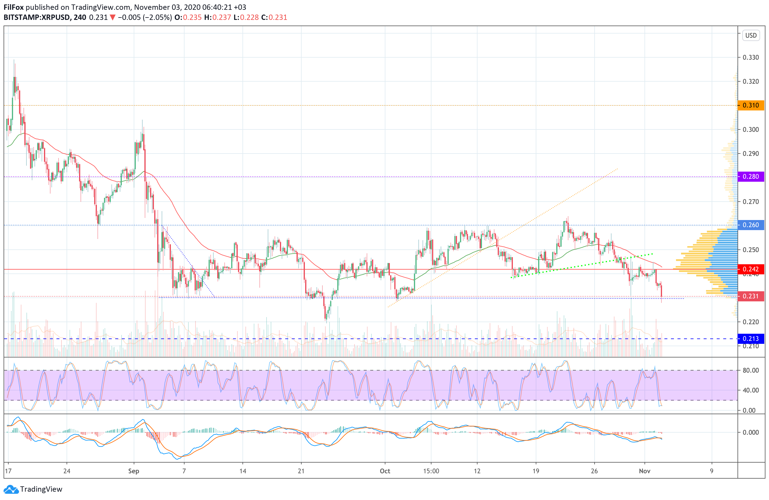 Вчера продавцы удержали цену Ripple ниже линии POC (0.242 USD), а до сегодняшнего утра пара уже успела проколоть нижнюю границу широкого бокового коридора 0.230 USD, в котором находилась почти два месяца.