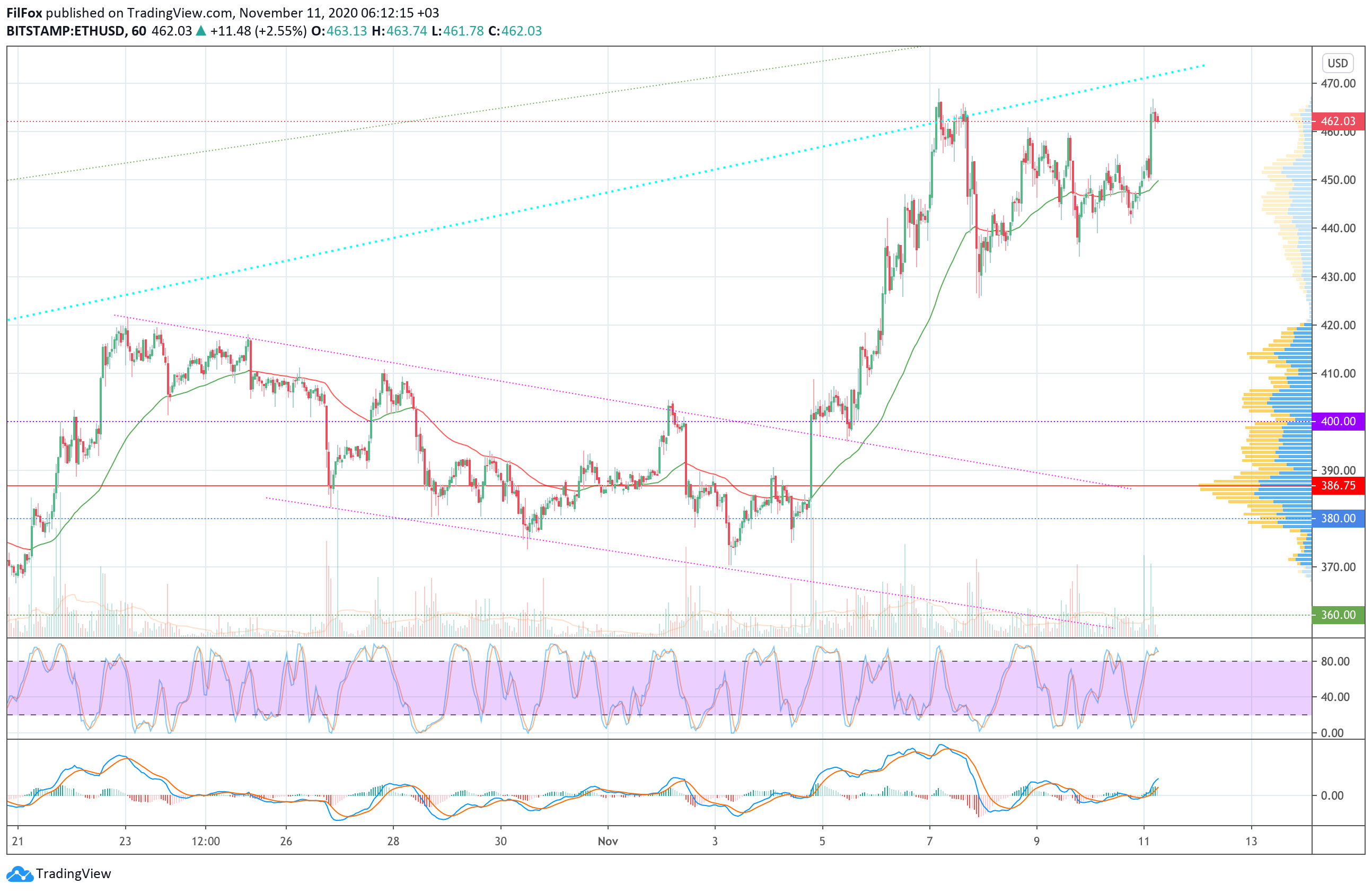 Вчера цена Ethereum консолидировалась в районе часовой EMA55, а сегодня ночью покупатели попытались сформировать бычий импульс и прорвались выше сопротивления 460.00 USD.