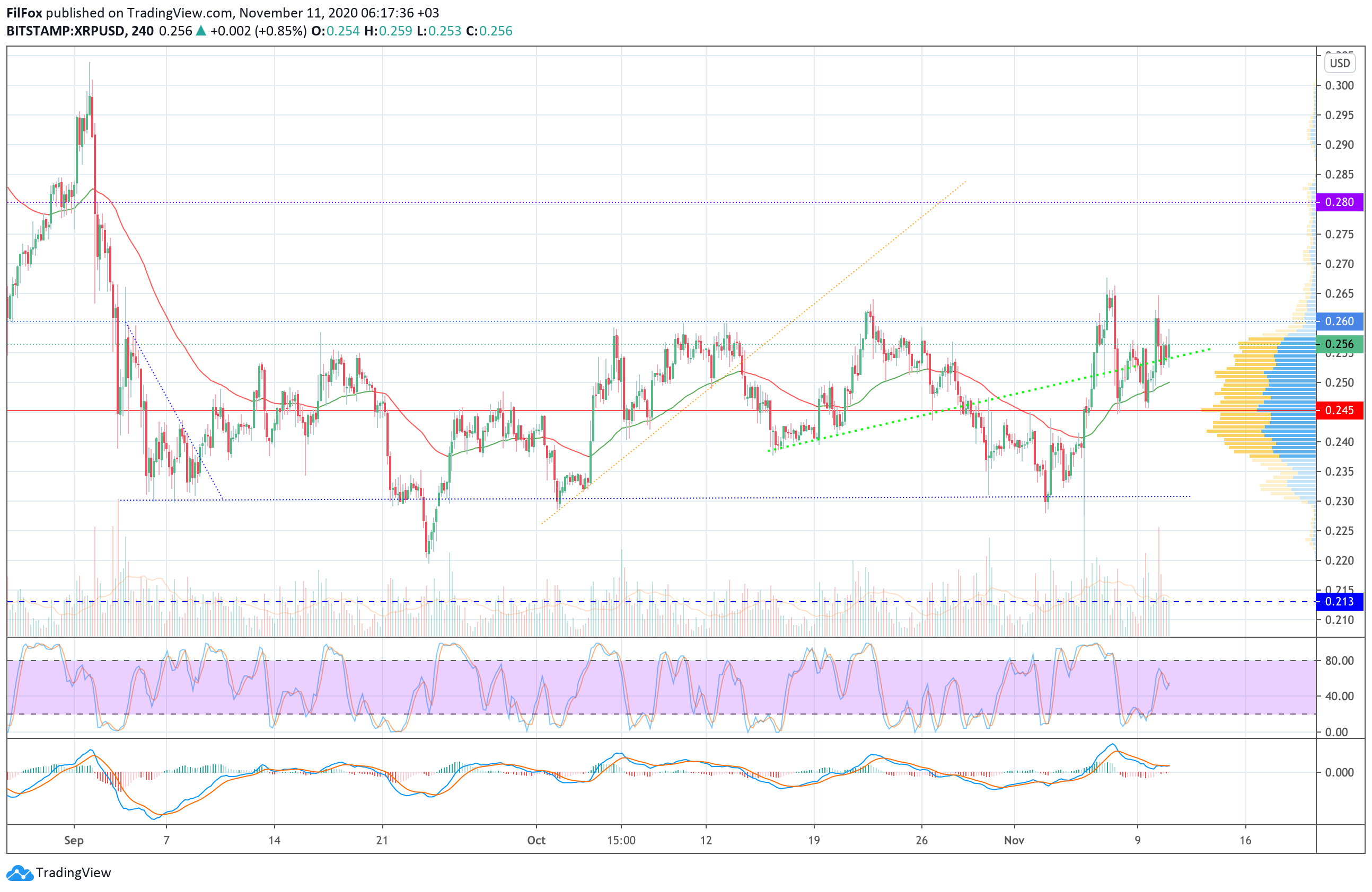 До завершения дня цена Ripple удержалась выше зелёной линии тренда и нащупала в этом районе поддержку. Если вчерашний оптимизм покупателей сохранится и сегодня, то цена может закрепиться выше сильного сопротивления 0.260 USD.