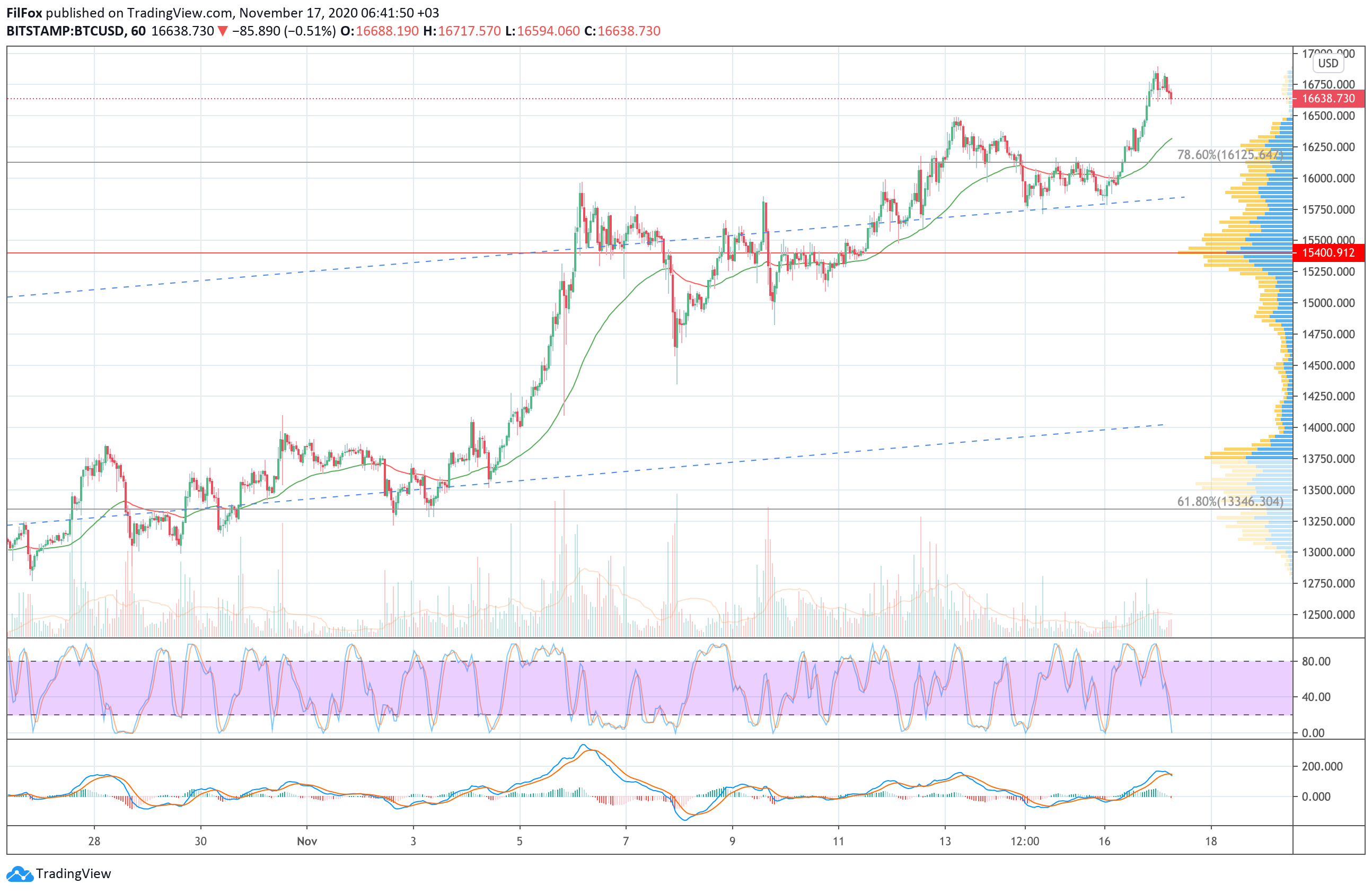 Медведи не смогли продавить поддержку верхней границы синего восходящего канала и цена Bitcoin восстановилась в зону годового максимума. Вчера вечером быки усилили натиск и преодолели сопротивление 16500.00 USD, а когда объёмы покупок уже начали сокращаться, цена BTC обновила годовой рекорд в районе отметки 16895.00 USD.