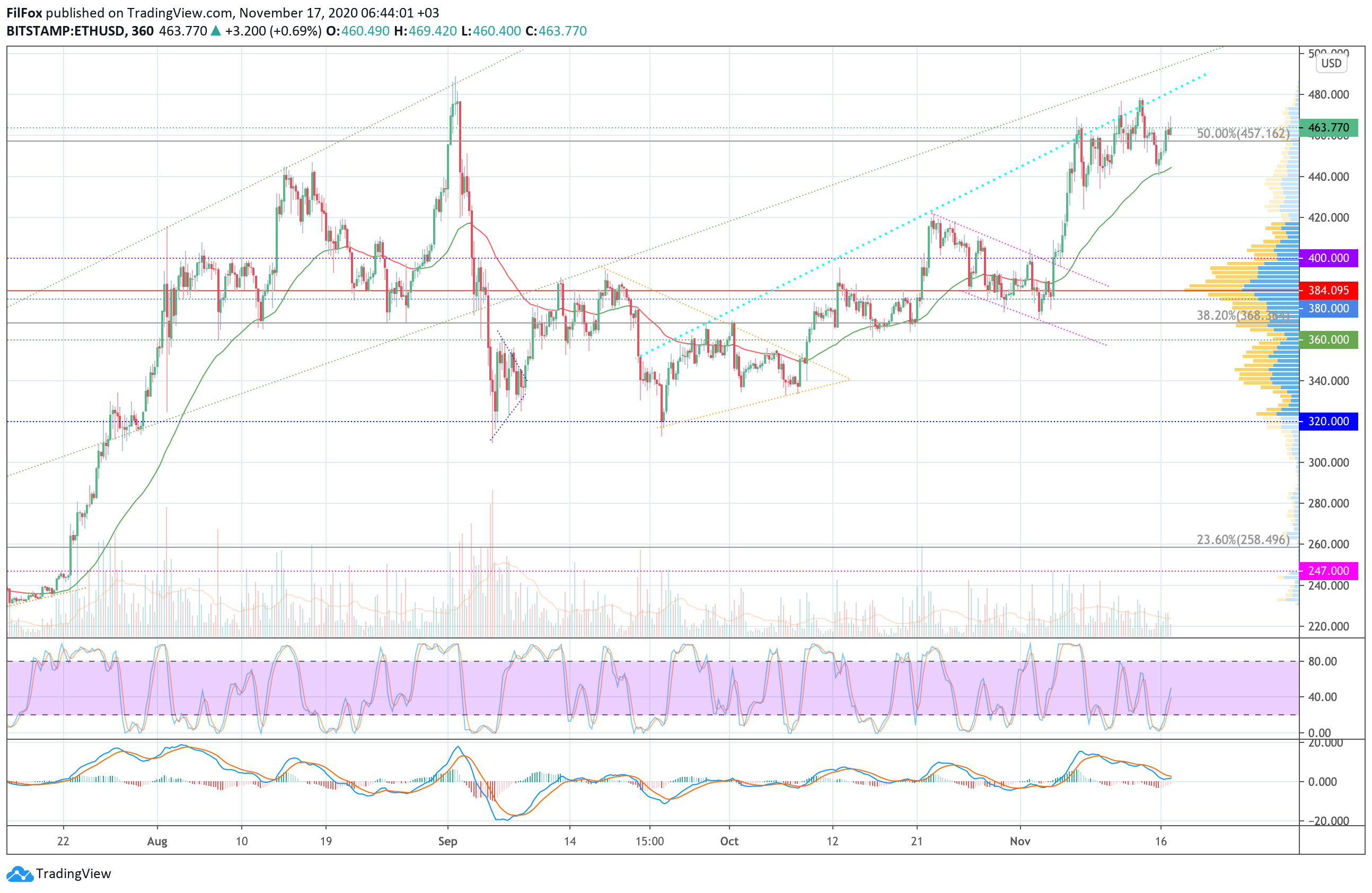 Откат пары ETH/USD, который начался в конце прошлой недели, остановился в районе шестичасовой EMA55. Покупатели смогли восстановить цену эфира выше уровня 50% фибо (457.16 USD).